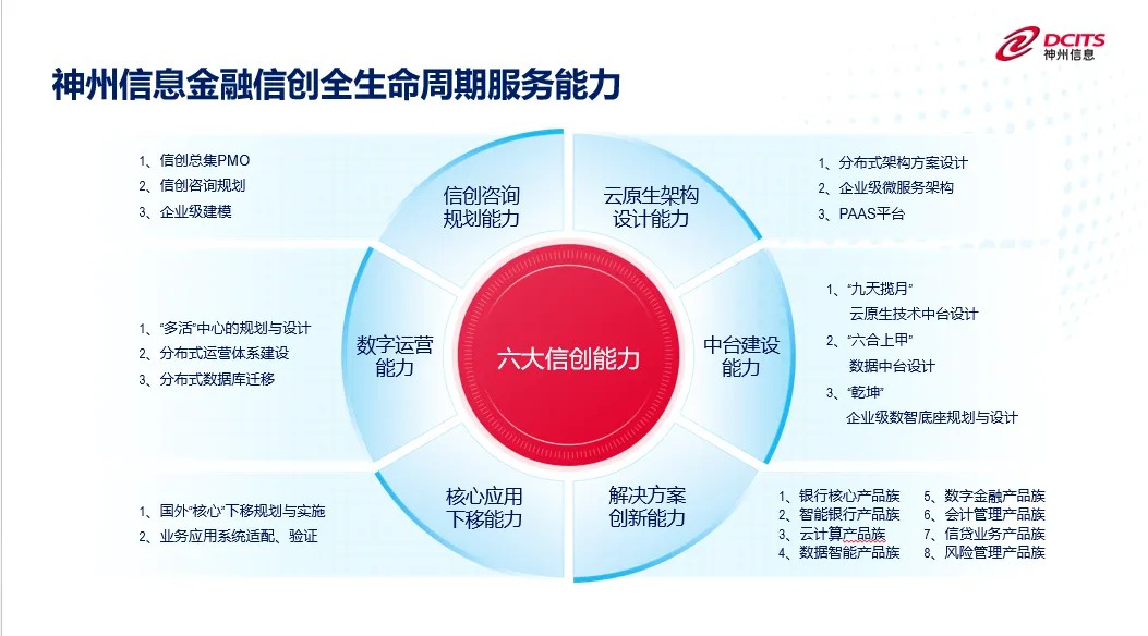 通过实践积累,神州信息已经形成了“信创咨询、架构设计规划、中台建设、解决方案实施、核心下移、数字运营”六大方面的金融信创全生命周期服务能力,帮助国内银行、保险、证券、泛金融机构提供一站式的金融信创服务。